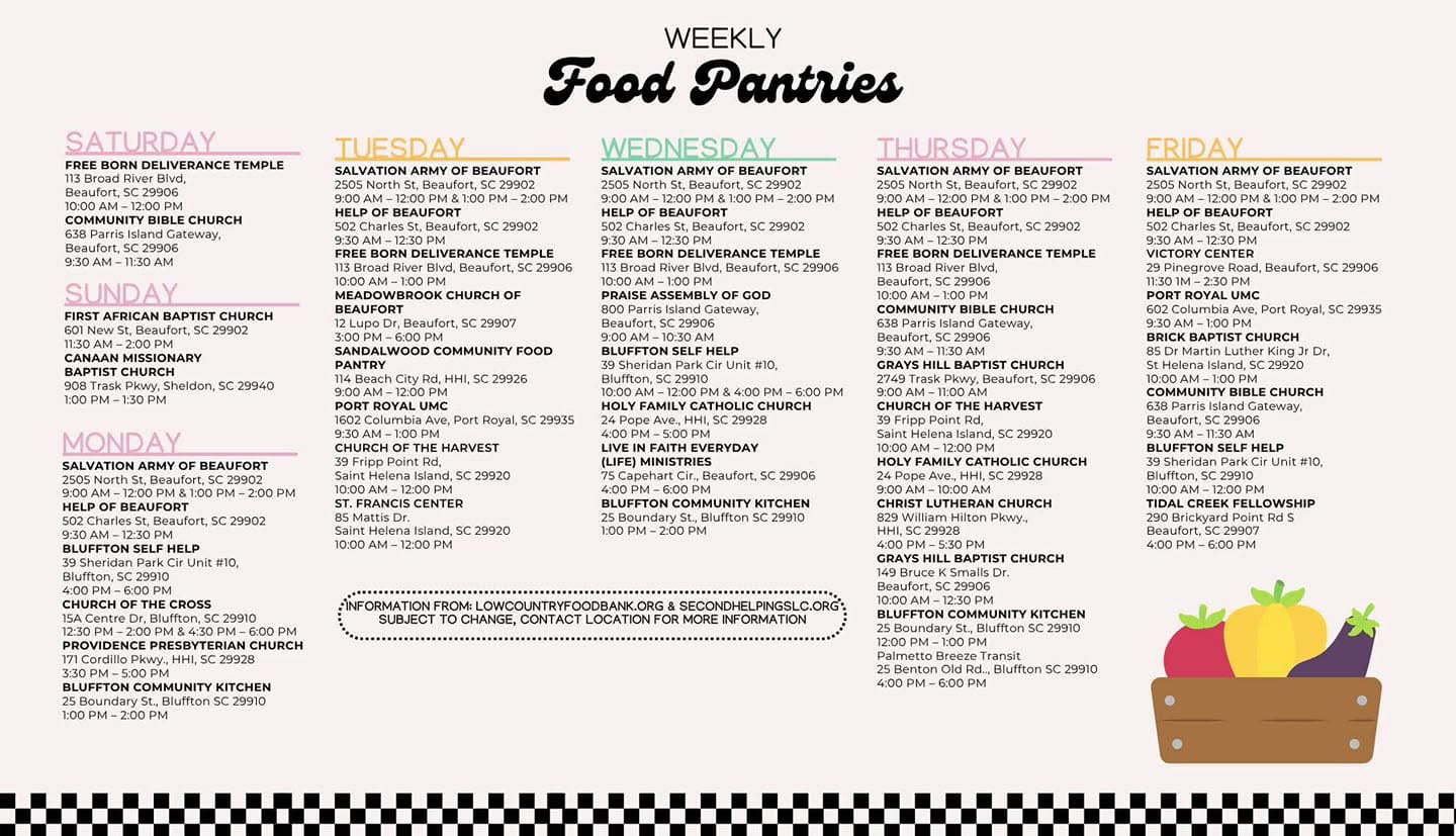 Find local food support: Our community has several food pantries and meal programs operating throughout Beaufort County and the Lowcountry, open on different days of the week.